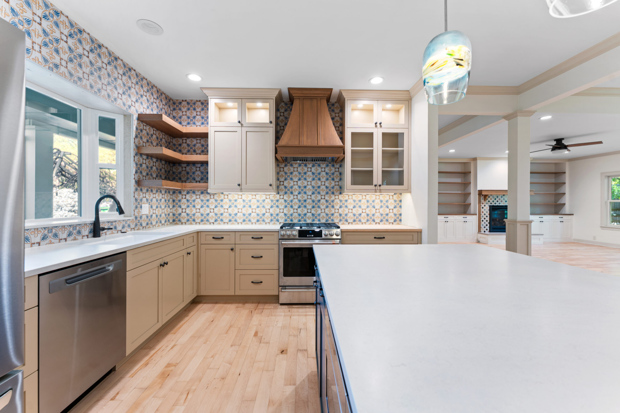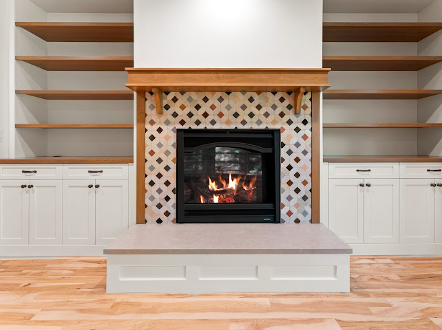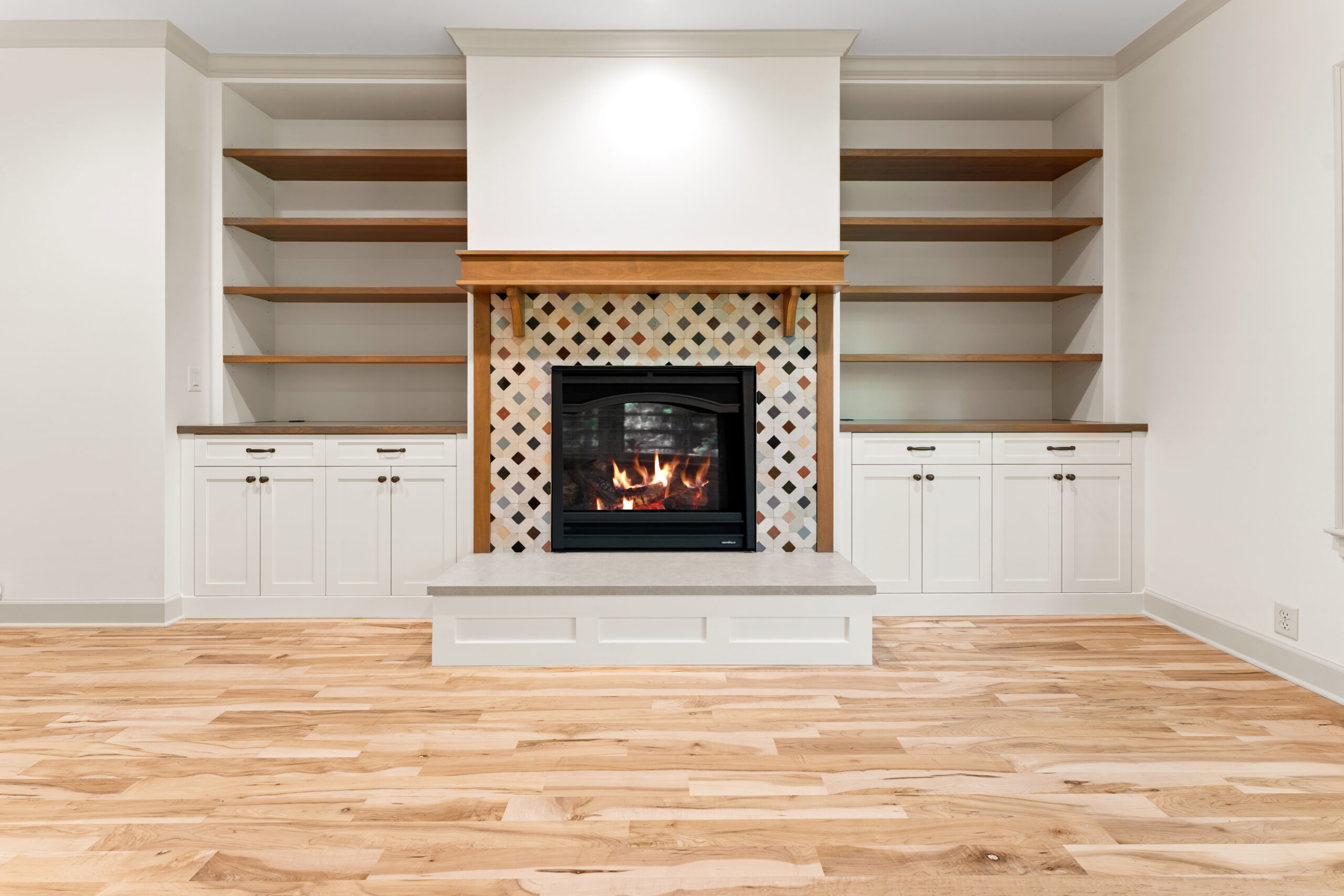 The living room received a complete fireplace remodel, including a new firebox, custom cabinetry with open shelving, a custom mantle, tile surround, and a slab hearth. The result is a modern fireplace redesign that anchors the room without overpowering it. Together, these spaces form a cohesive, updated interior and a full home remodel that honors the original footprint while bringing the home into the present.