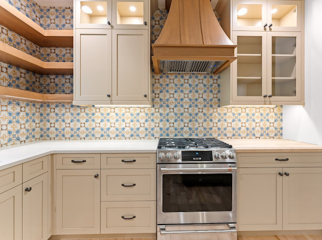 The custom kitchen features a hood liner, floating shelves, and under-cabinet LED lighting that creates warm, layered illumination across the workspace. Glass-front upper cabinets with LED puck lighting add depth and display space, a modern kitchen design detail that balances form and function.